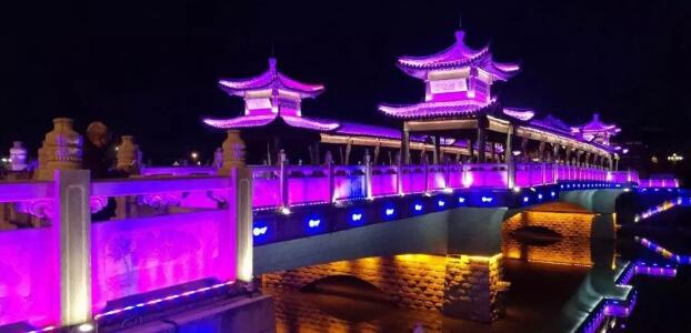 太平橋用隱藏式的瓦楞投光燈照亮建筑屋面,變幻四季顏色,絢麗多彩,形成一定的韻律感,河中倒影給人波光粼粼的勝境,整體氣勢恢弘,在橋的欄桿下一側用定制的祥云圖案燈順序排列,寓意祥和、太平,突出太平盛世文化。