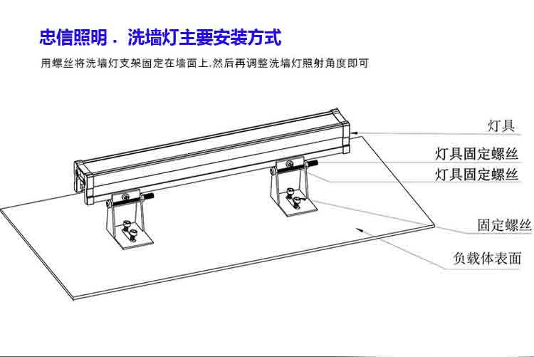 一:根據(jù)燈具、電源的所放置的位置來做好安裝前工作;安裝時調整好洗墻燈的照射角度,用螺絲將燈具固定牢靠(詳見下面的示意圖);